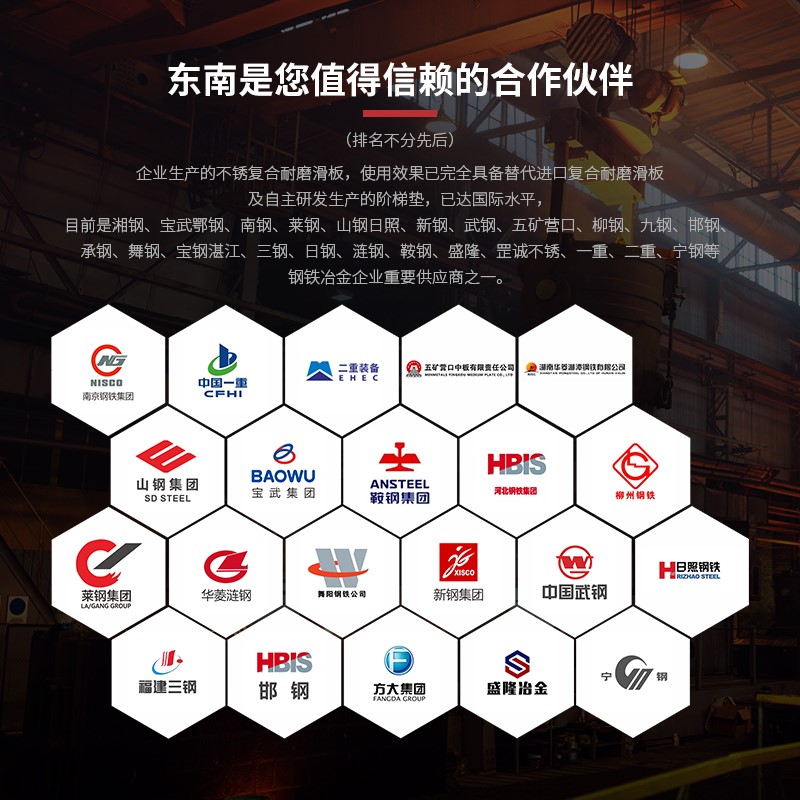 溫州東南工業(yè)機(jī)械實(shí)業(yè)有限公司創(chuàng)辦于1994年,是一家集研發(fā)、制造、銷(xiāo)售、安裝服務(wù)為一體的冶金設(shè)備配套制造企業(yè)。企業(yè)專(zhuān)業(yè)從事冶金設(shè)備及各種非標(biāo)件等產(chǎn)品的科研、國(guó)產(chǎn)化開(kāi)發(fā)、生產(chǎn)、安裝服務(wù)的現(xiàn)代化高新科技企業(yè)。并在2006年公司憑著卓越的市場(chǎng)開(kāi)拓能力和良好的產(chǎn)品銷(xiāo)售業(yè)績(jī)與科研單位合作研制開(kāi)發(fā)了:軋機(jī)機(jī)架與軋輥軸承座之間不銹復(fù)合耐磨滑板、剪機(jī)高性能滑板系列、自潤(rùn)滑耐磨板、高壓除鱗閥及標(biāo)印機(jī)零部件的國(guó)產(chǎn)化,并經(jīng)多家企業(yè)投產(chǎn)使用。不銹復(fù)合耐磨滑板完全達(dá)到可以替代國(guó)外公司原裝廠(chǎng)配件的使用壽命。并對(duì)軋機(jī)階梯墊進(jìn)行改進(jìn)。階梯墊基板材料采用DNTZ-80合金鋼鍛件,在階梯墊硬面層采用耐腐蝕高耐磨合金材料熔焊焊接工藝。 產(chǎn)品具有良好的抗沖擊性,高耐磨性,耐腐蝕性及力學(xué)性。是原階梯墊使用壽命3倍以上,至今已擁有十分成熟的制造技術(shù),并且得到國(guó)內(nèi)鋼鐵企業(yè)的認(rèn)可和好評(píng)。